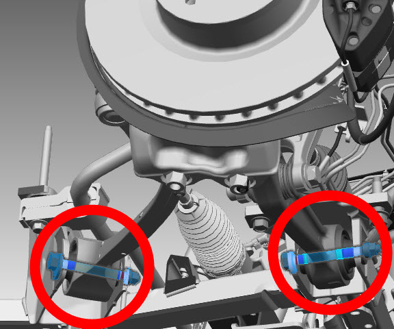 - Remove the bolts (x4) that attach the subframe to the body (80 Nm for bolts that attach the front stabilizer bar mount to the body, and 115 Nm for bolts that attach the front subframe to the body).