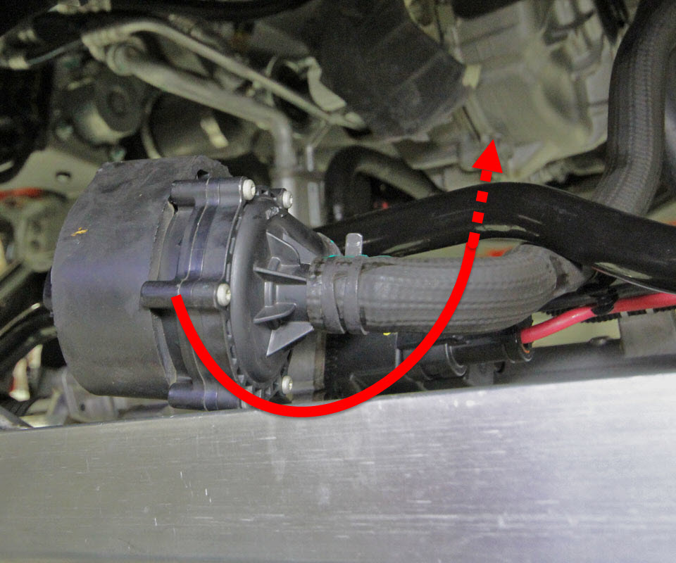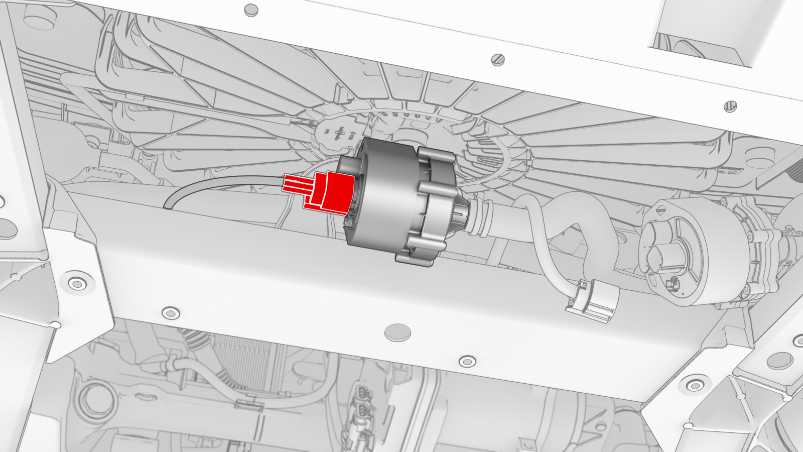 - Remove battery coolant pump 1 from the bracket on the subframe and set the pump aside.