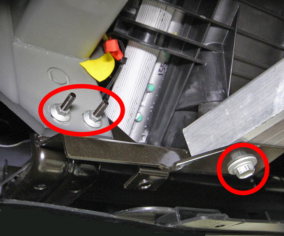 - On each side of the vehicle, reinstall the condenser fan module bracket to provide support for the condenser fan module.
