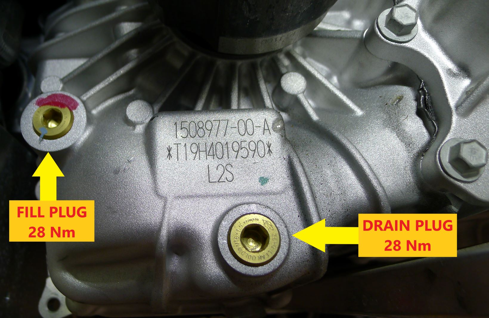 - Remove the rear drive unit fill plug (torque 28 Nm), and then remove the rear drive unit drain plug (28 Nm) to drain the fluid into the oil drain container.