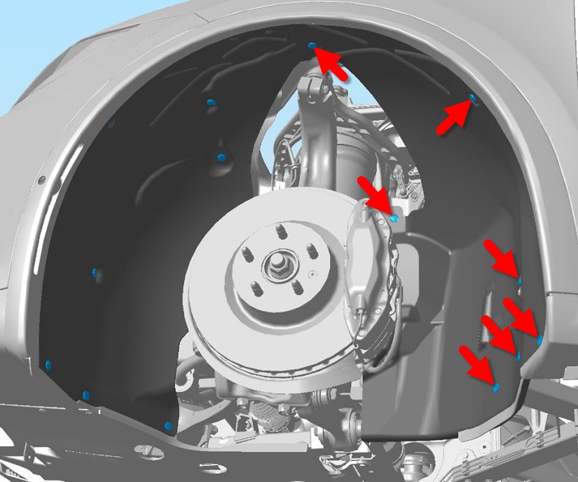 - Remove the rear nut that secures the wheel arch liner to the stud on the chassis (torque 6 Nm).