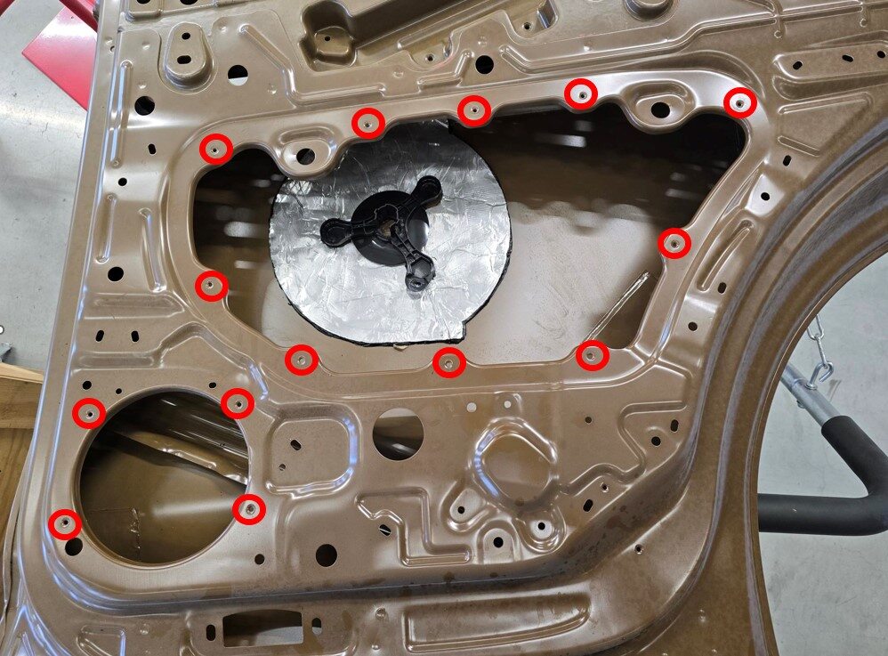 - Use a 7.5 mm drill bit to drill the holes (x14) to install rivet nuts on the falcon door.