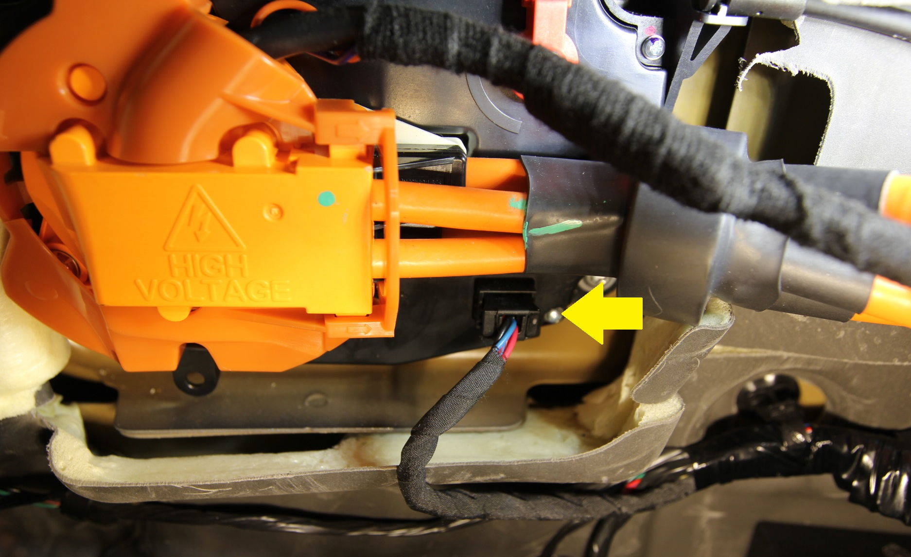 - Remove the bolts (x3) that secure the HV harness to the charge port in the order shown (torque 5 Nm), and then remove the harness.