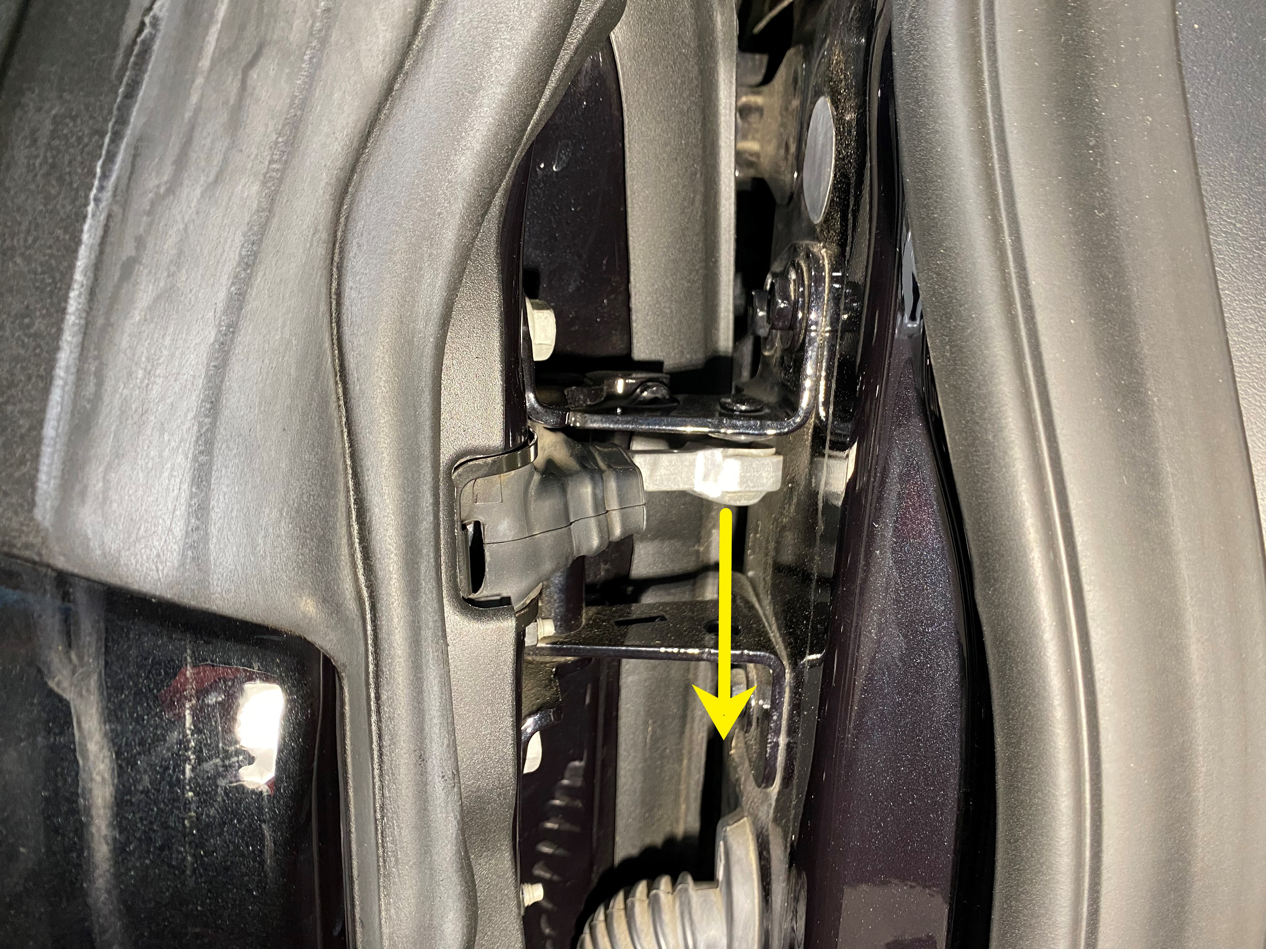 Remove Position the door approximately 80% of the way open. Push the front regulator track outboard to provide access to the front door drive unit. Use a small pry bar to push the push the linkage down and disconnect it from the ball stud. Remove and discard the plastic cap.
