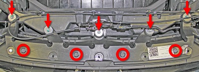 - Remove the push clips (x4) and bolts (x5) that secure the front upper grille carrier (torque 7 Nm).