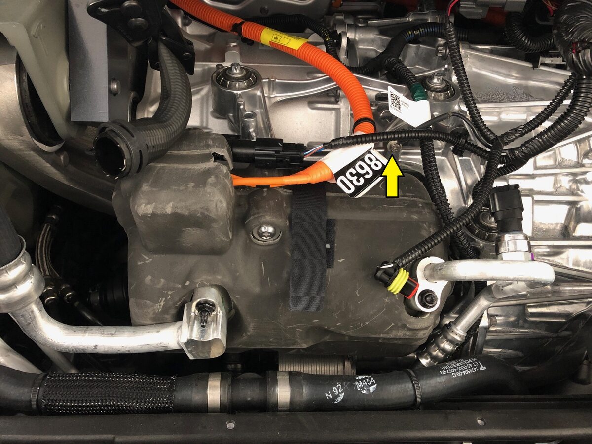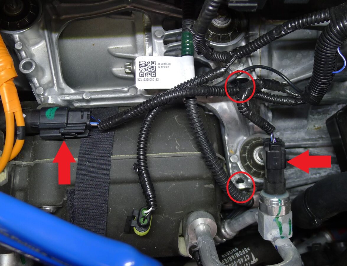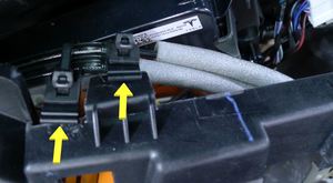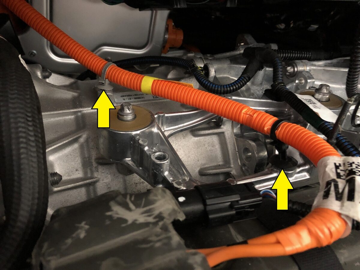 Install the fir tree clips securing the A/C compressor HV harness to the front drive unit