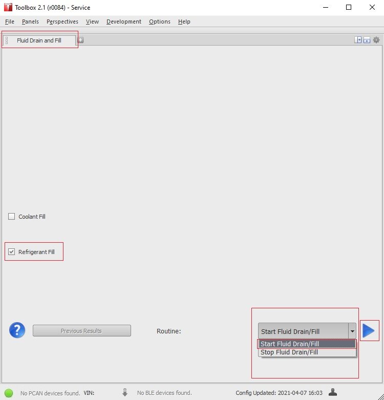 In toolbox, run the refrigerant drain and fill routine to enable A/C filling