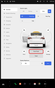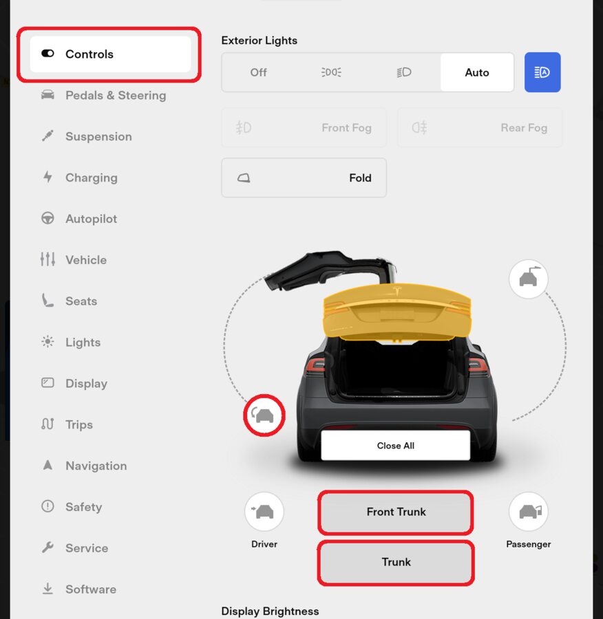 NoteVia center display > Controls > Front Trunk, Trunk, LH Falcon Door