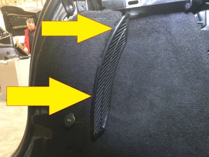 Note2x connectors, Disconnect trunk light and 12V outlet connectors before removal, Pull rear lower corner of LH trunk side carpet panel out and downwards to remove panel