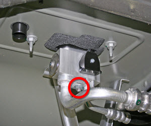 - Working from beneath the vehicle, remove that nut that secure the pipes to the condenser (torque 10.5 Nm). Gently pull the pipes away from the condenser.