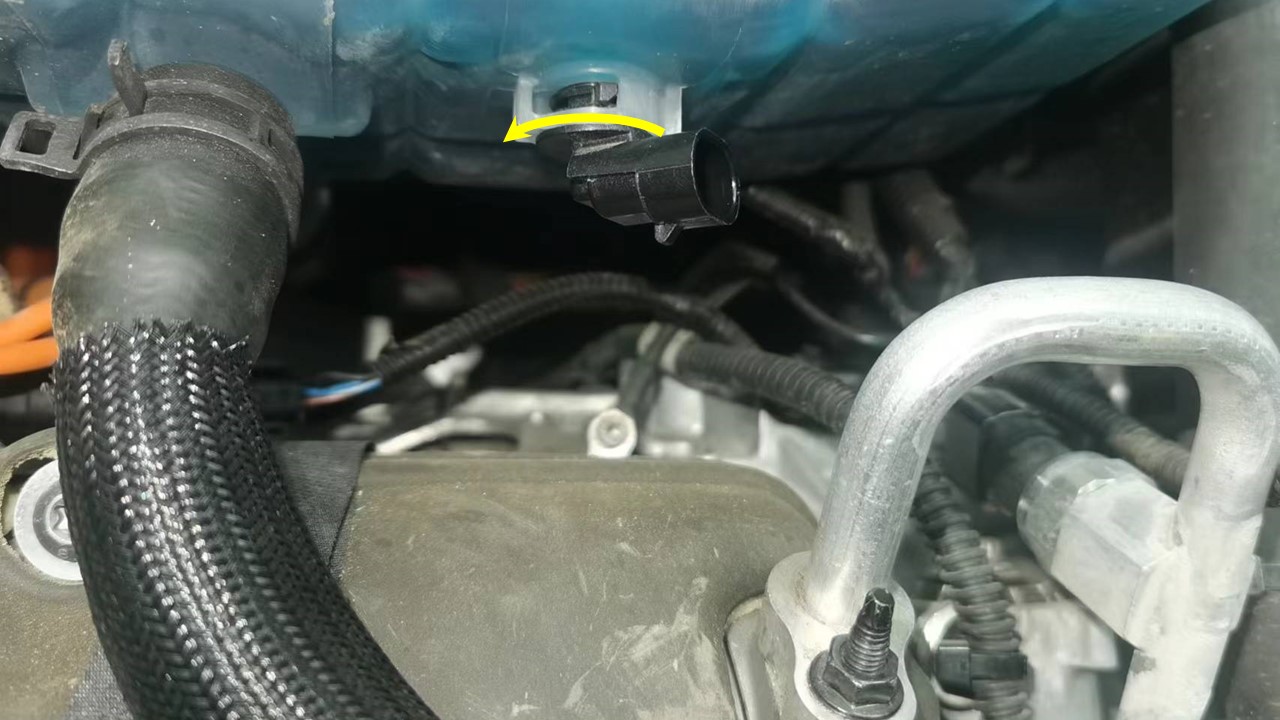 - Remove the coolant level sensor assembly by rotating it 90 degree counterclockwise.