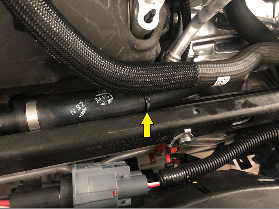 - Remove the clip that attaches the cowl drain hose to the 4-way valve using a clip pry tool.
