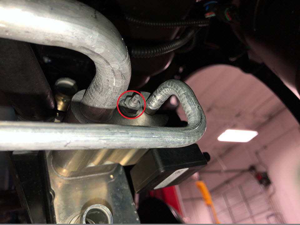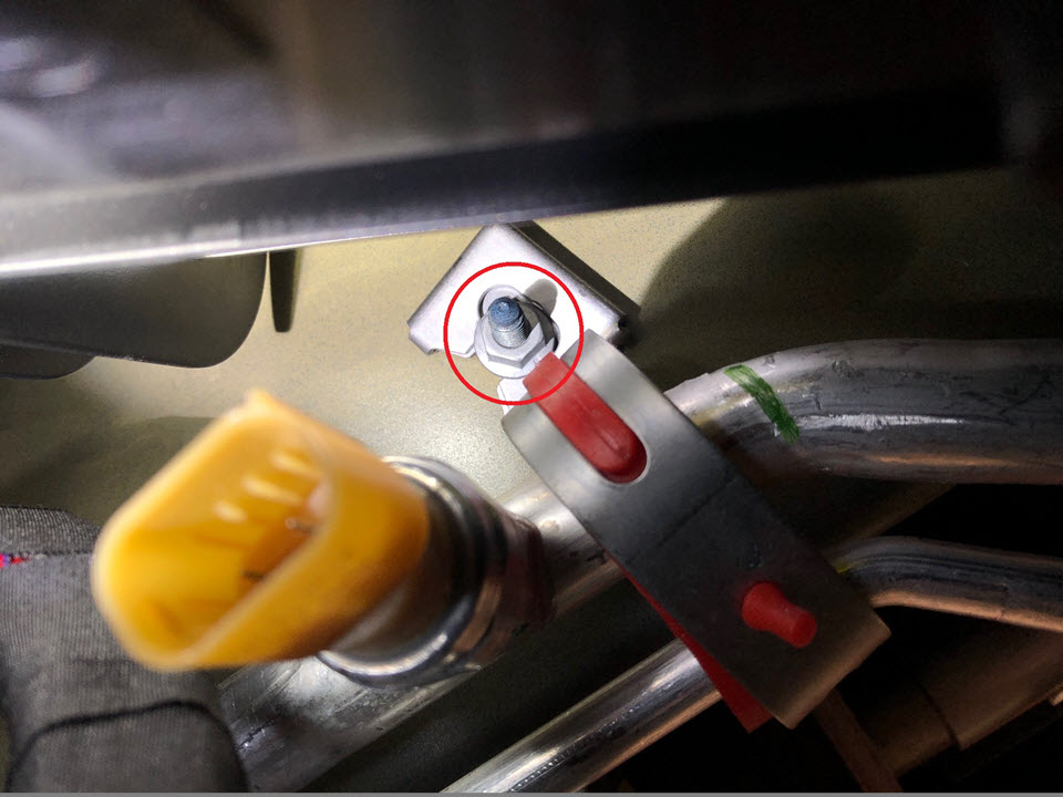 - Remove the bolts (x2) that attach the suction liquid jumper A/C line to the support beam.