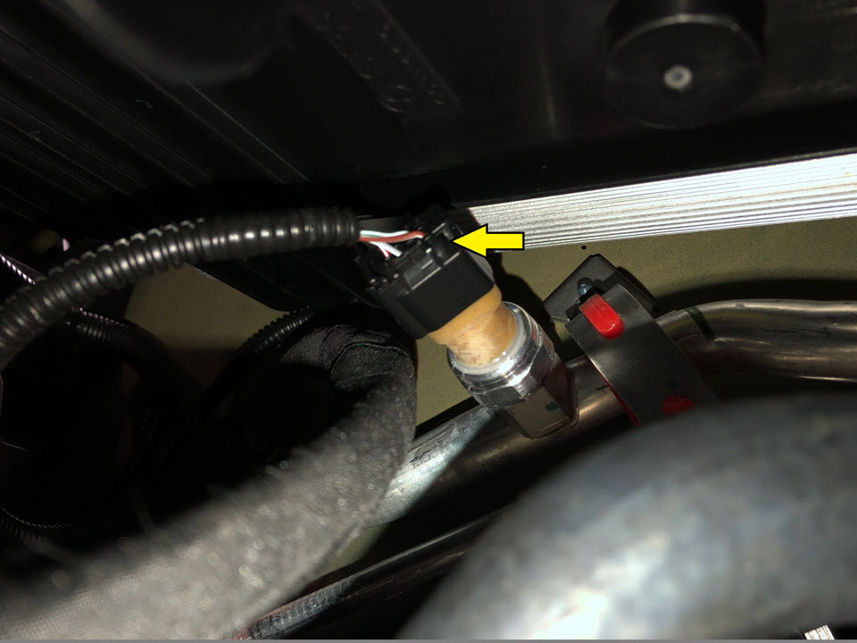- Disconnect the pressure sensor electrical connector on the suction liquid jumper A/C line.