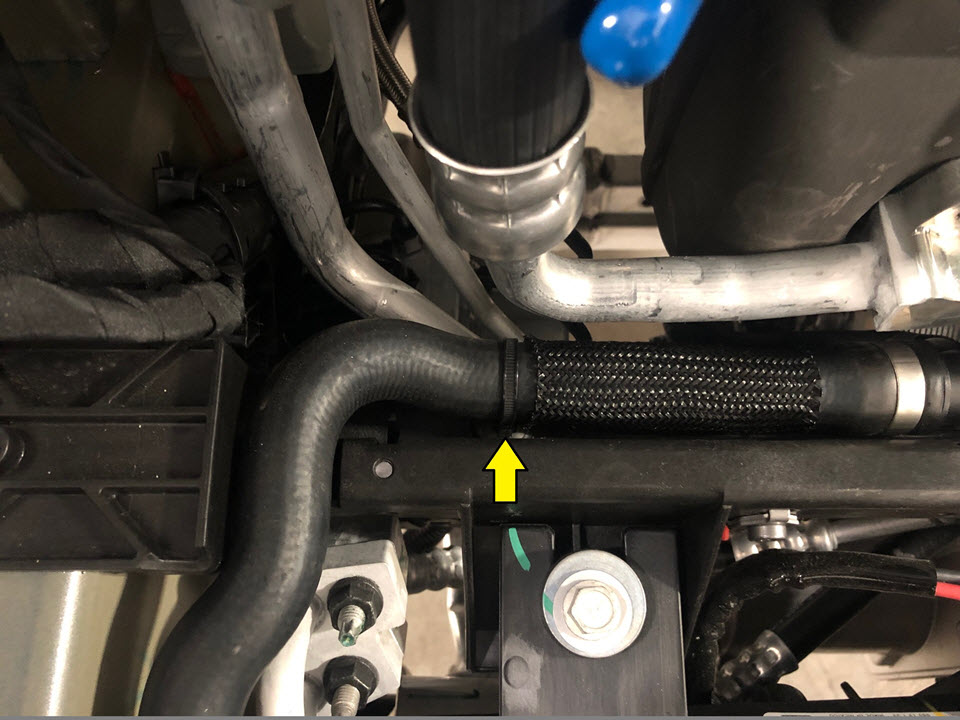 - Remove the retaining clips (x2) that attach the front drive unit outlet hose to the support beam.