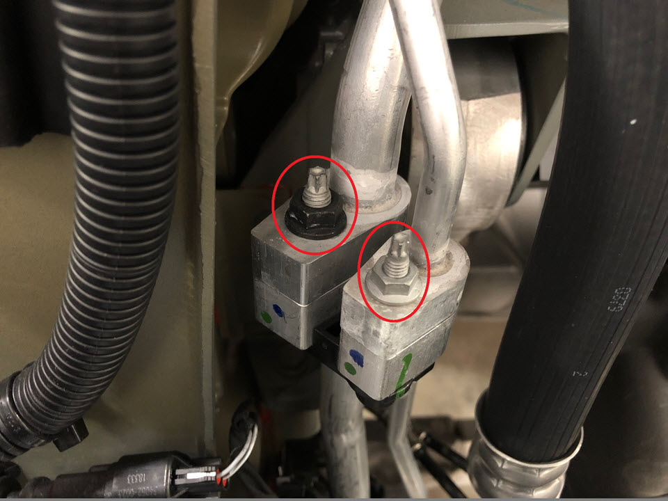 - Remove the nuts (x2) that attach the suction liquid jumper A/C line to the suction liquid TXV line.