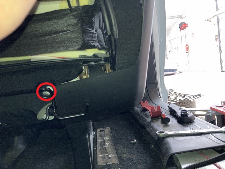 - Release the push clip at the front of the outer side seat trim and loosen the bolt at the rear (torque 2.5 Nm), and then remove the outer side trim.