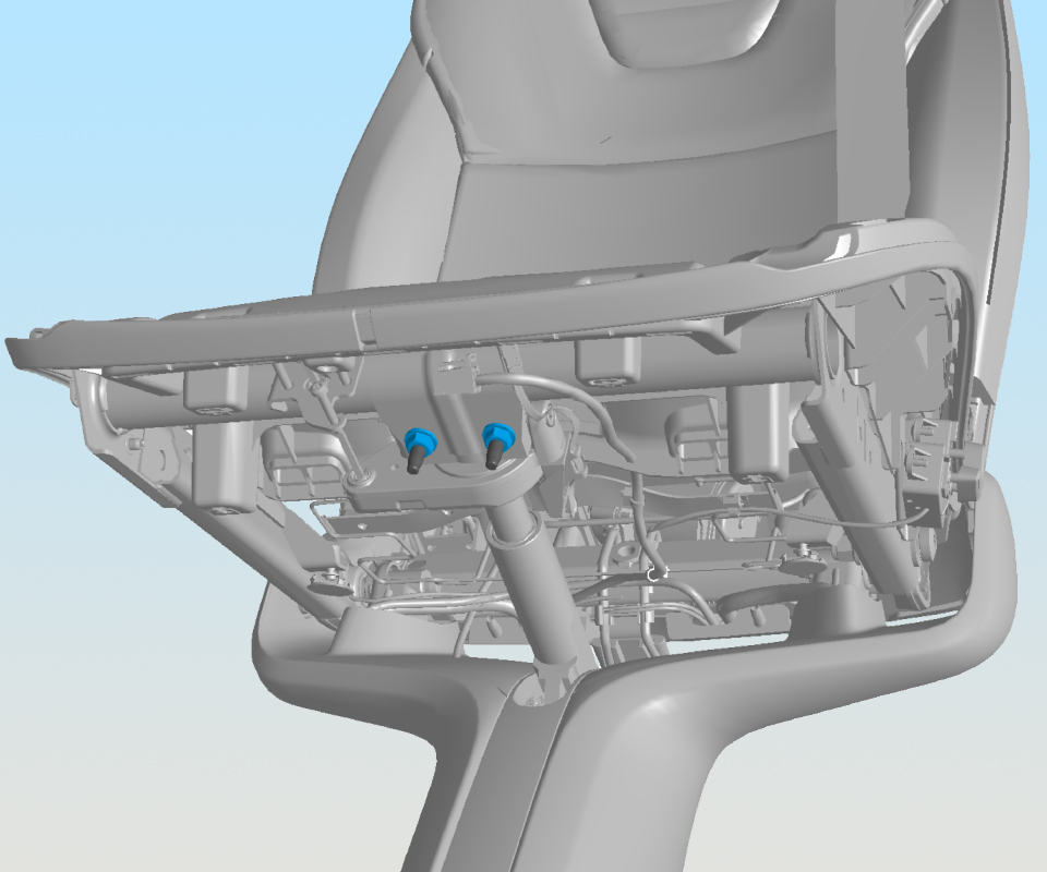 - While lifting the lower cushion foam away from the bottom of the seat frame, remove the screws and nuts that secure the pitch mechanism to the seat (torque 20 Nm).