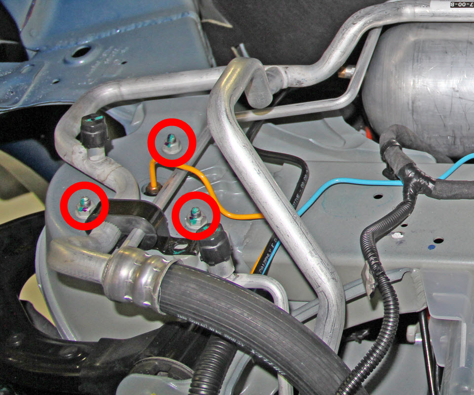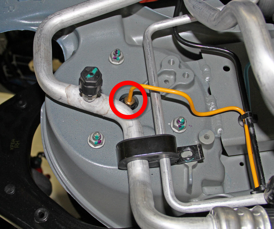- Remove the bolt that secures the brake line bracket to the air spring module (torque 7 Nm).