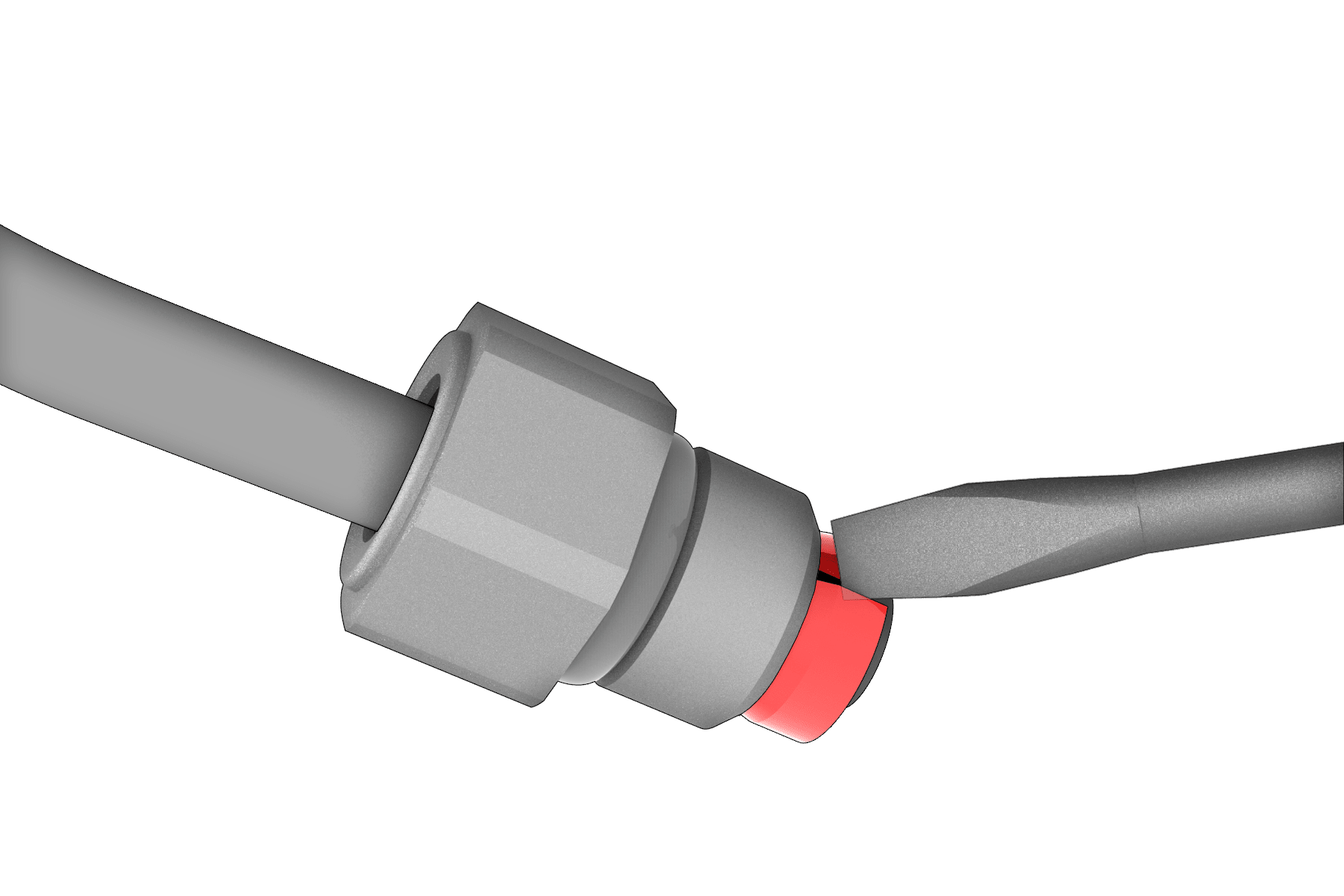 - For each released end of an air suspension line, use a flat blade screwdriver to snap off the old collet, and discard the collet and nut (VOSS fitting).