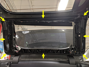Note17x clips, Align strut cover first, 1x connector may be present on early production vehicles