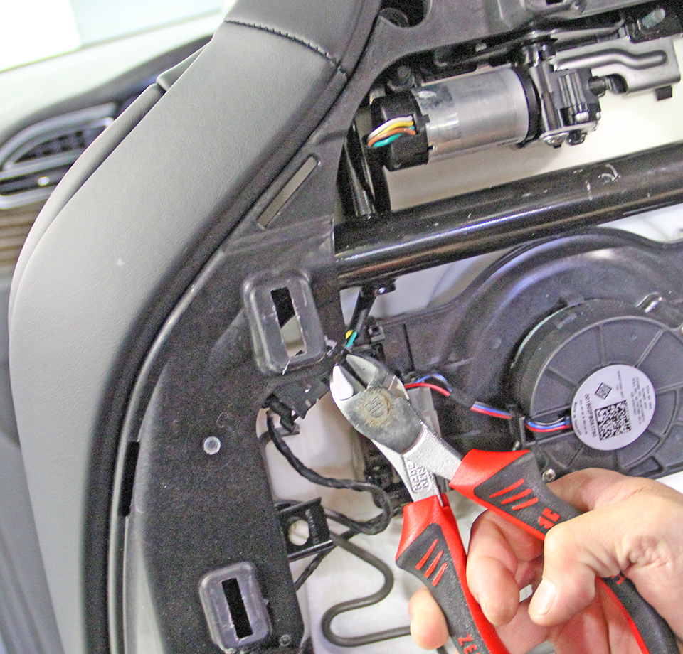 Carefully cut the cable tie that secures the headrest motor harness to the