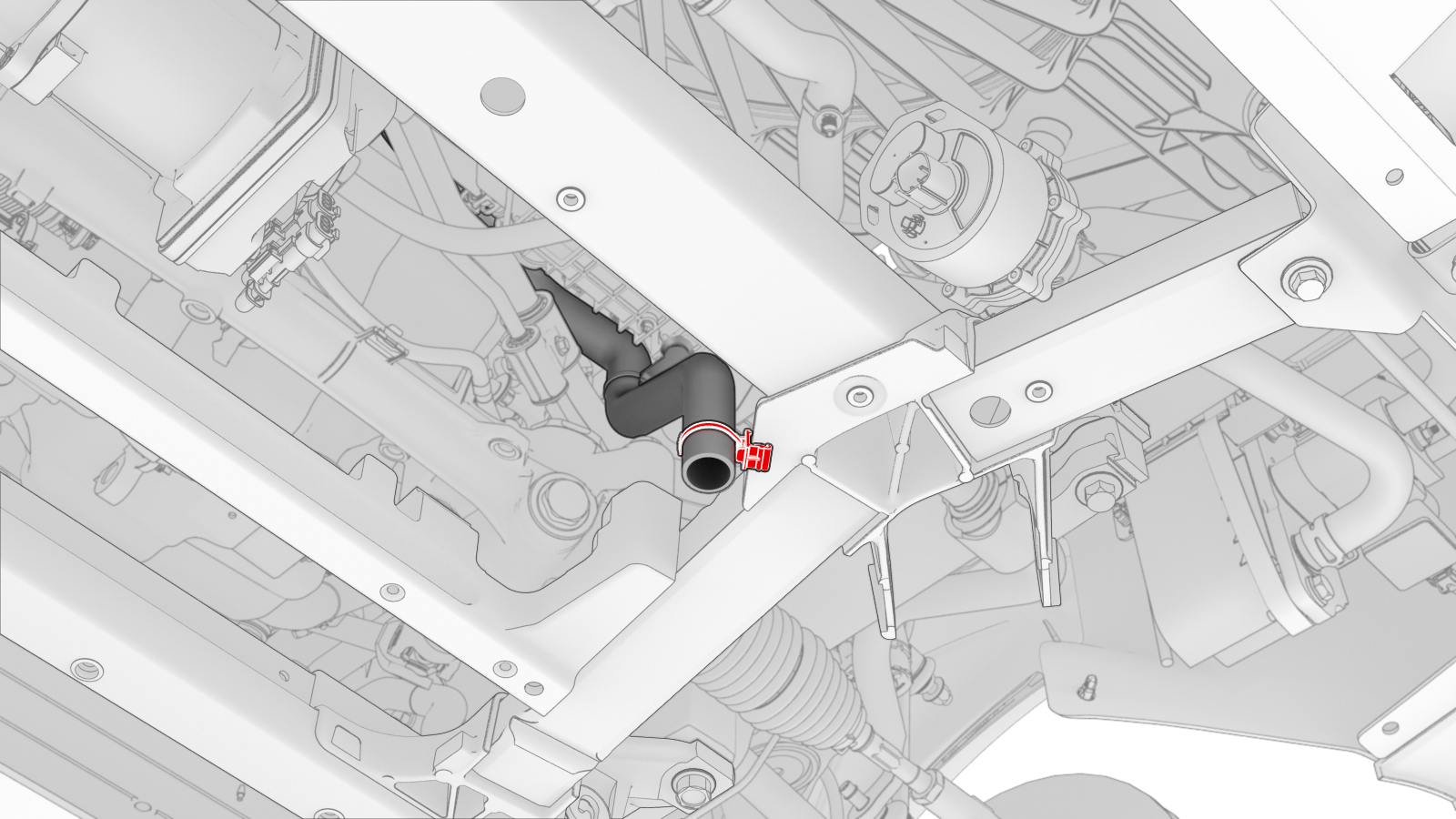 Disconnect the hose from the battery coolant heater to coolant pump 2 at the rear of the front subframe assembly, and then plug with a hose clamp from the coolant hose plug kit..