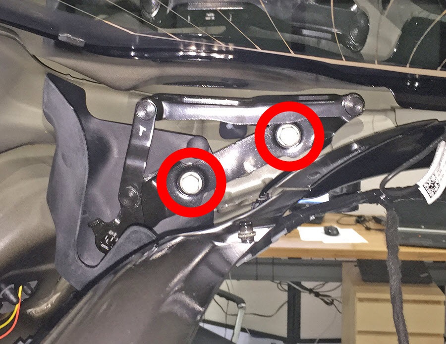 - Remove the bolts (x2) that secure the hinge to the liftgate (torque 8 Nm).