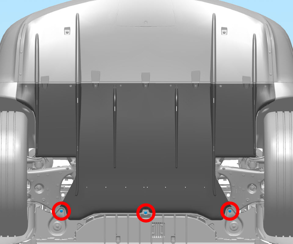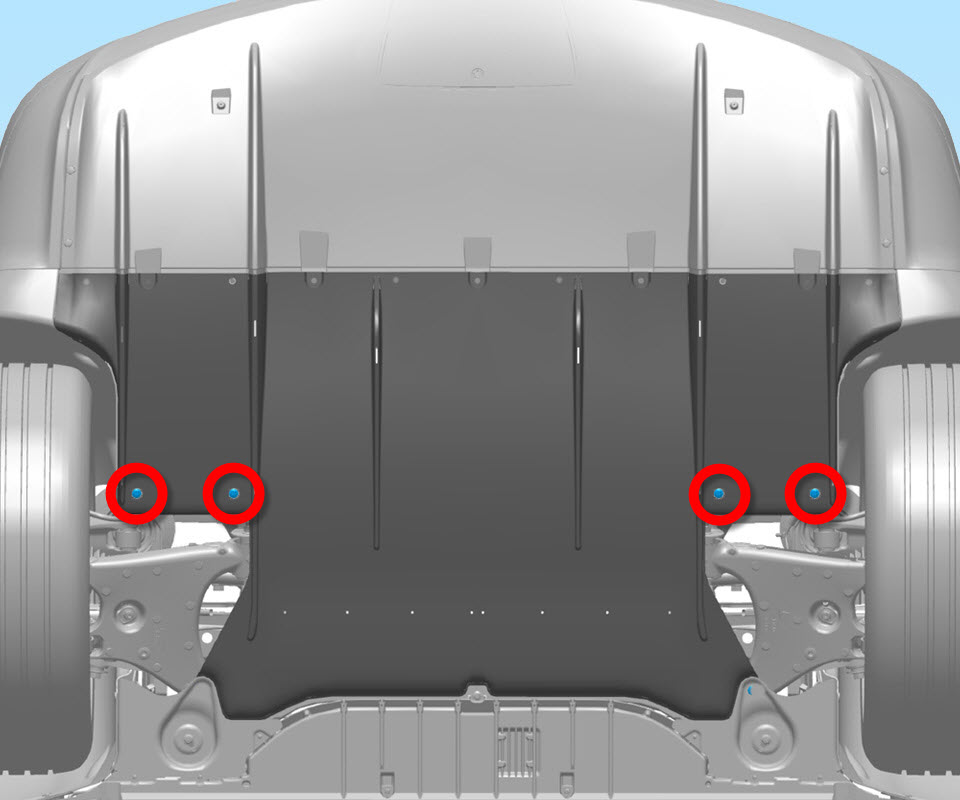 - If equipped, remove the bolts and washers (x4) that secures the mid aero shield to the bracket (torque 4 Nm).