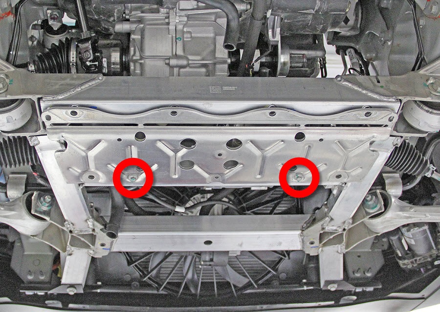 - Remove the bolts (x2) that attach the skid plate to the front subframe.
