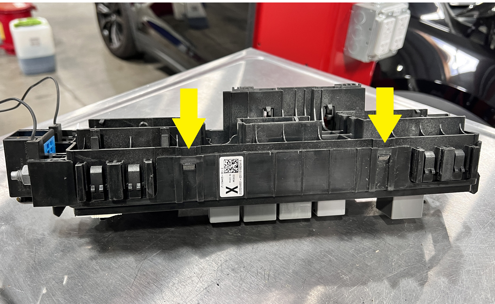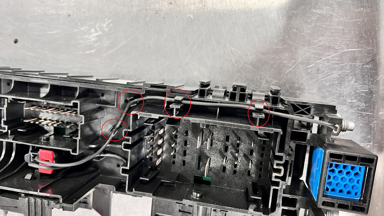 - On the new (replacement) fuse box, install the wires to the underside of the fuse box housing.