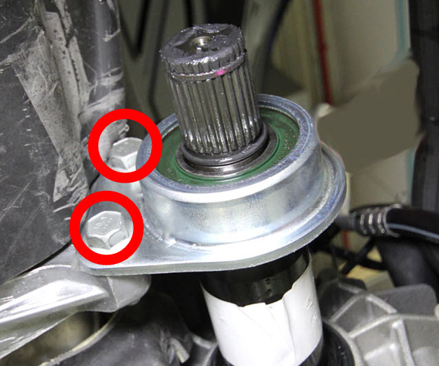 - Install the jackshaft to the front drive unit, and then install the bolts (x2) that attach the jackshaft to the front drive unit (torque 30 Nm).