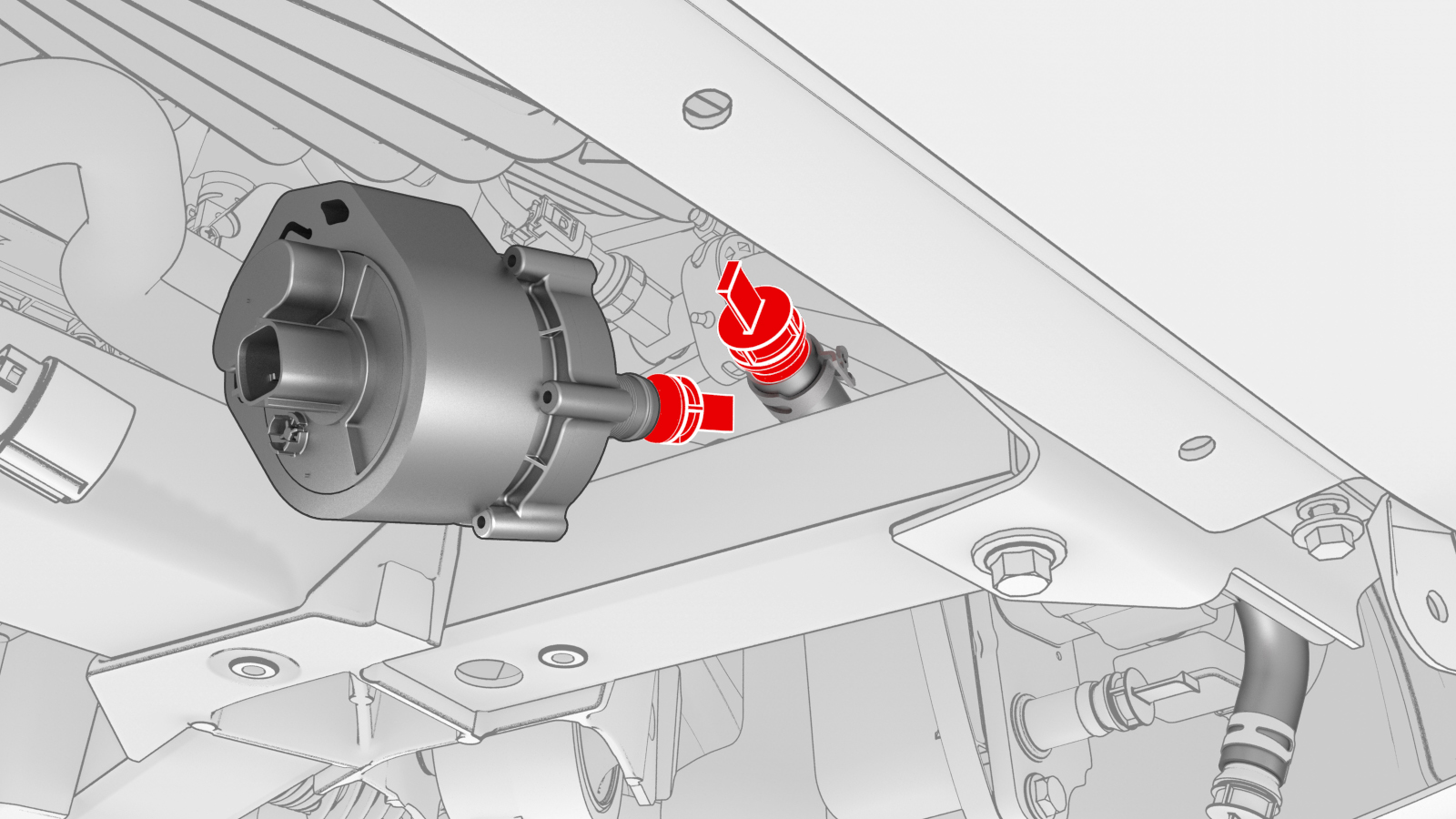 - Disconnect the hose clamp, and then disconnect the hose from the chiller-to-battery coolant pump 1 (pump side). Plug the coolant hose using a plug from the coolant hose plug kit.