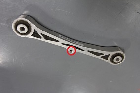 - Loosen but do not remove the nut and bolt that secure the upper suspension link to the subframe (torque 130 Nm). This releases tension on the bushing prior to removal. Removal takes place in another step.
