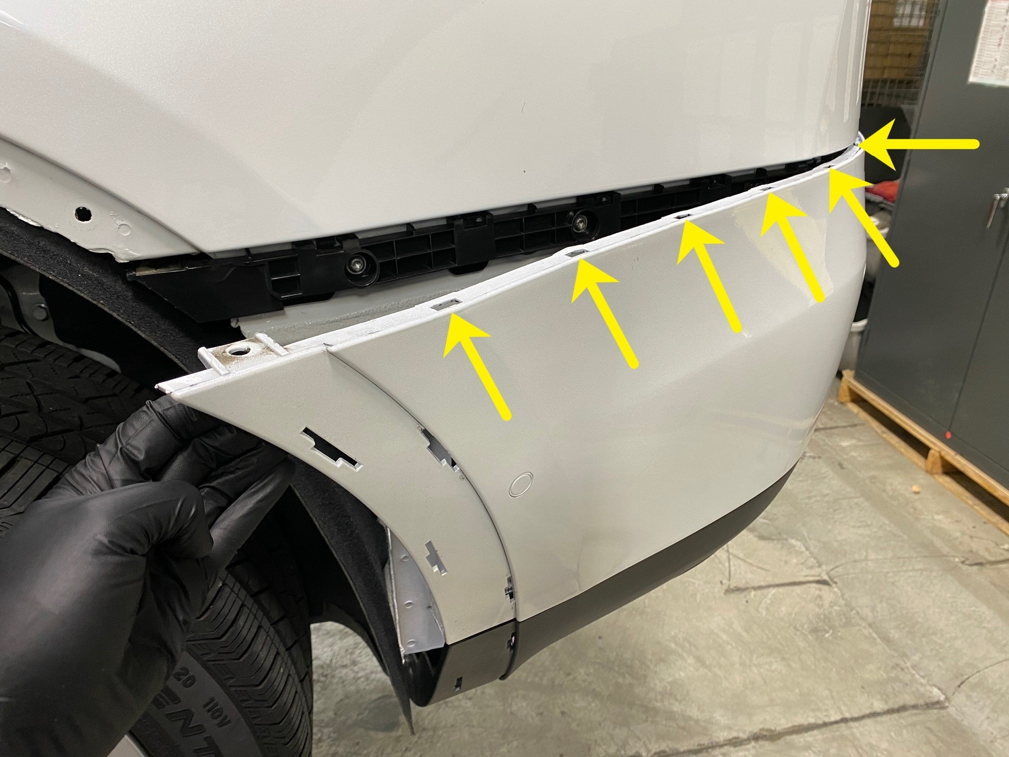 - Remove the clip that attaches the LH rear fender garnish to the mid aero shield.