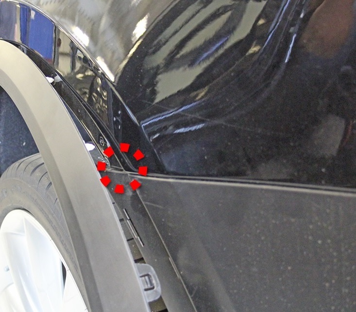 - Carefully move the LH side of the rear fascia back into position and install the tabs (x6) that attach the fascia to the LH rear wing bracket.