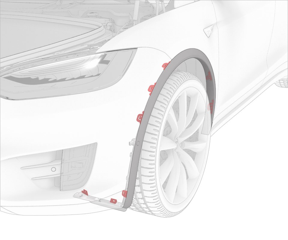 - Remove the bolts (x2) that attach the LH wheel fairing to the LH front fender garnish and front fascia lower valance.