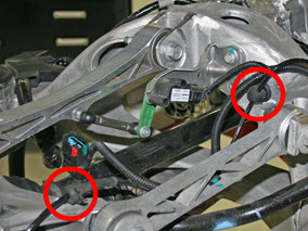 - On each side of the rear subframe, release the 2 grommets that attach the wheel speed sensor harness.