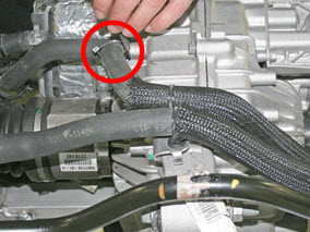 - At the front of the small rear drive unit, remove the bolt that attaches the coolant hose bracket (torque 5.5 Nm).