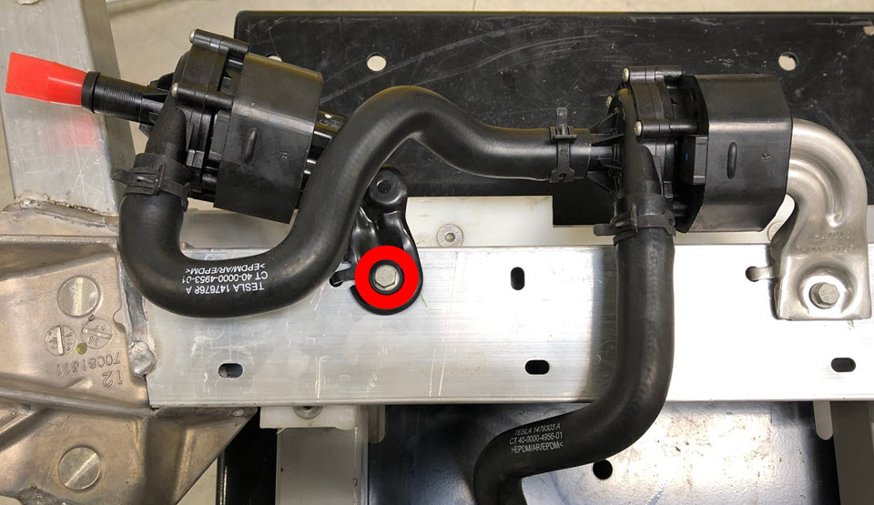 - Remove the bolt that attaches the battery coolant pump 1 bracket to the front subframe (torque 12 Nm). Allow the pump to hang at this time.