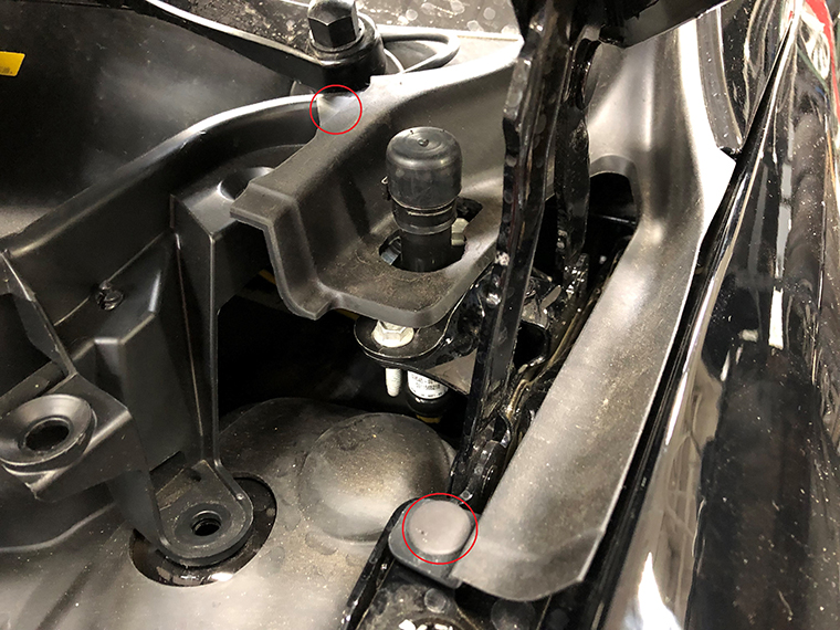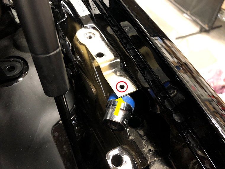 Tip: Use a 19 mm socket to support LH apron attachment bracket against the body while removing the bottom of the rivet.