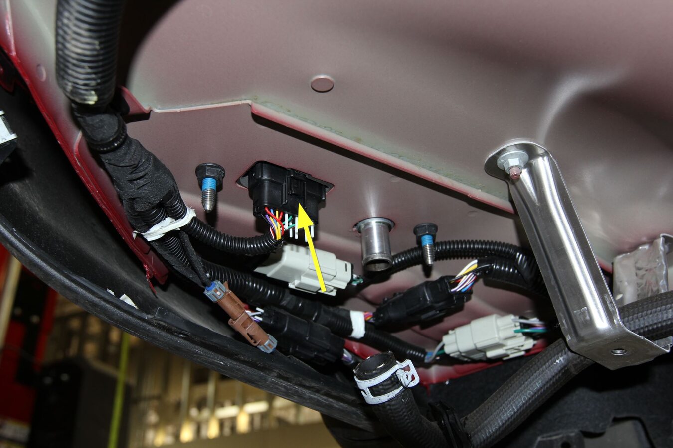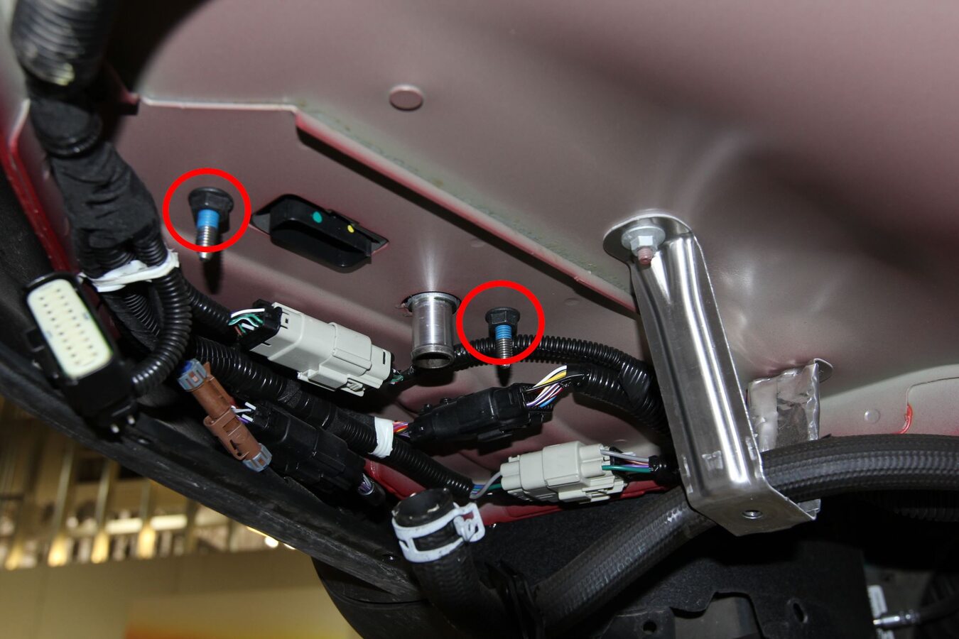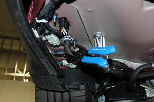 - Attach the PTC harness barrel clips (x2) to the D-pillar and charger bolt studs.