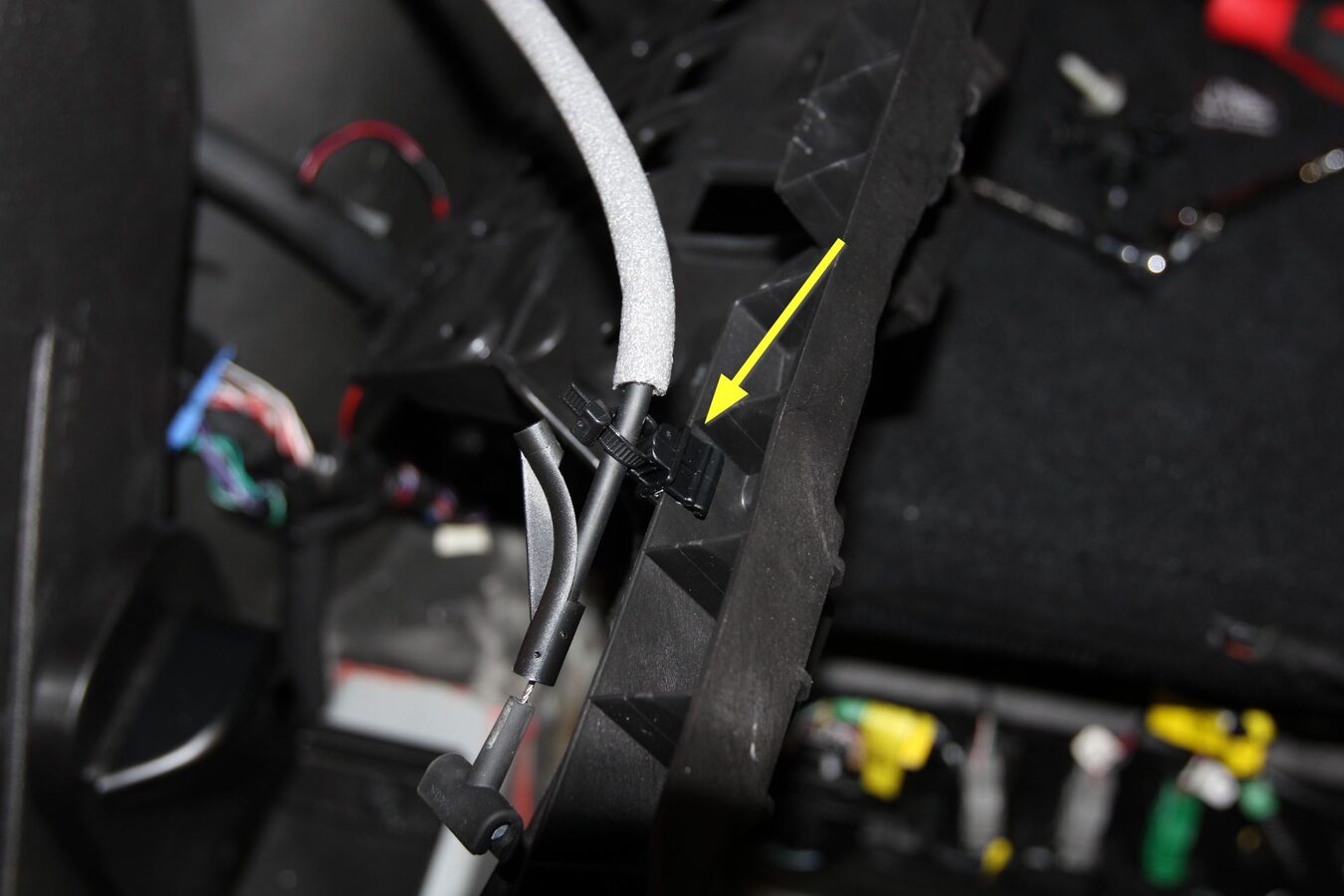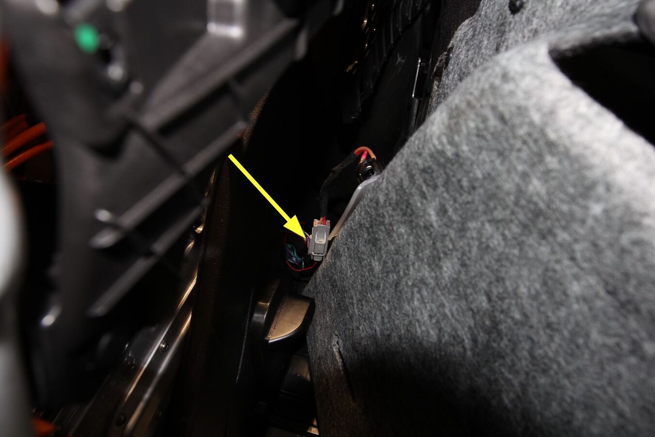 - Release the PTC harness barrel clips (x2) from the D-pillar and charger bolt studs.