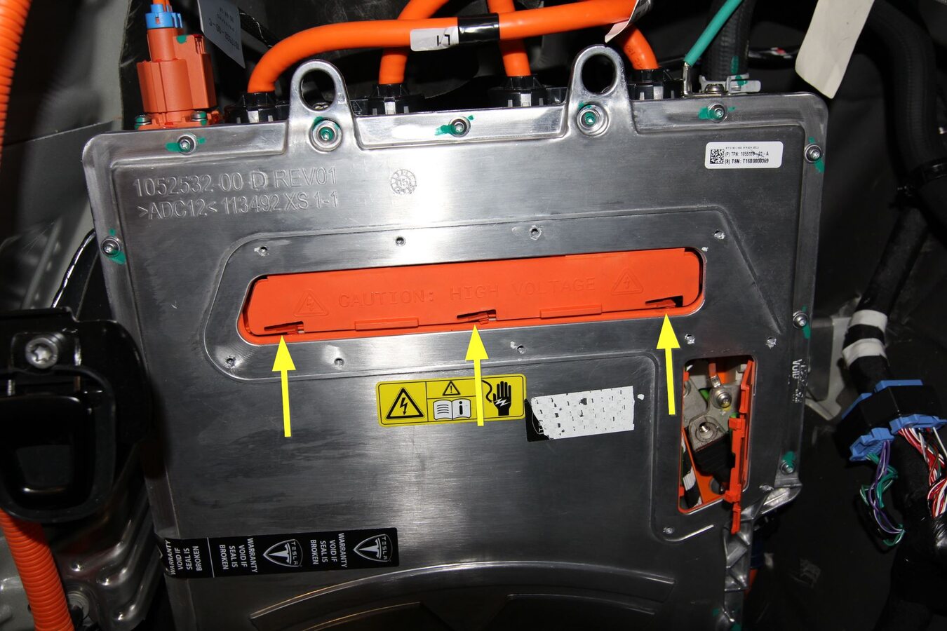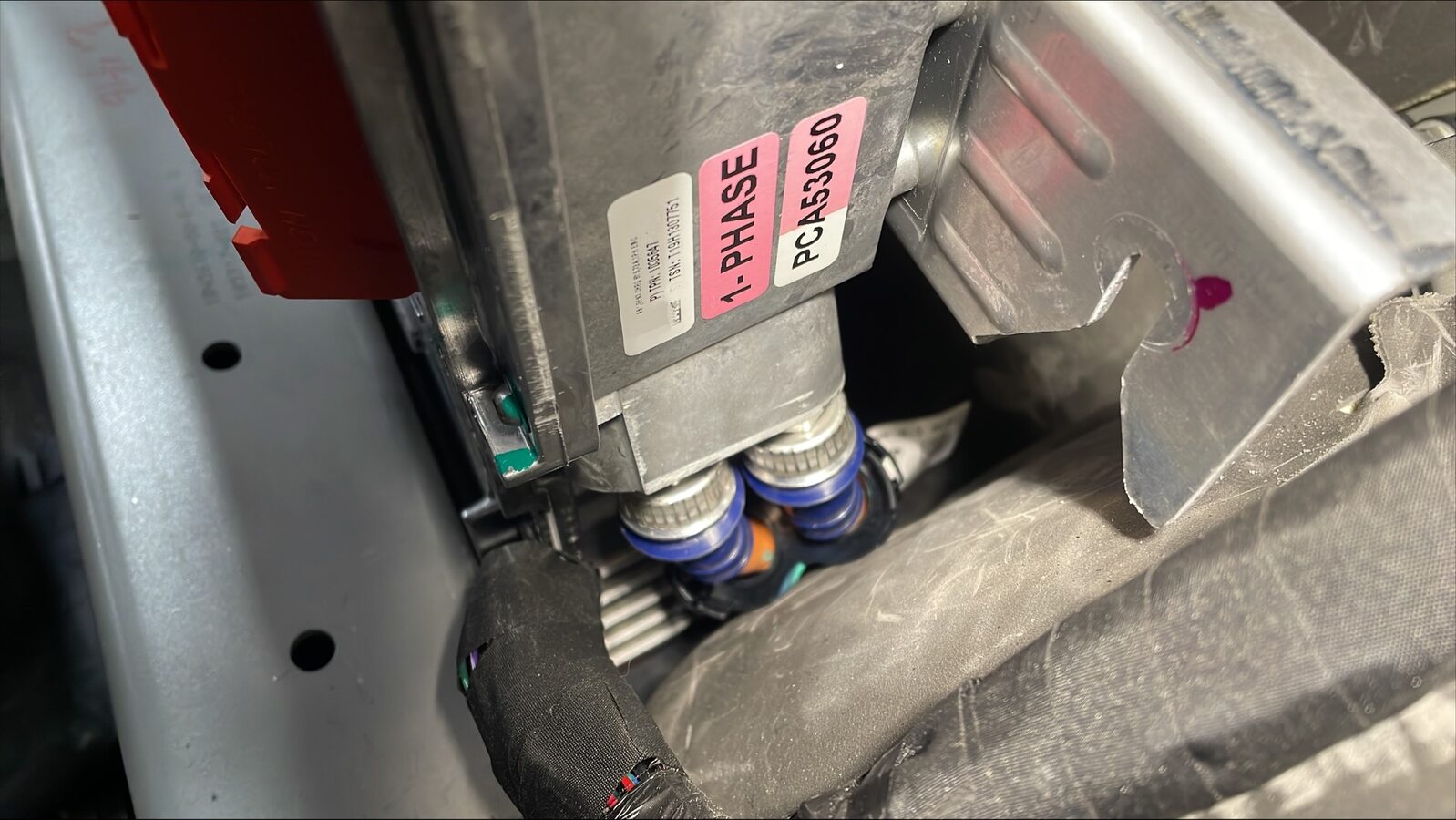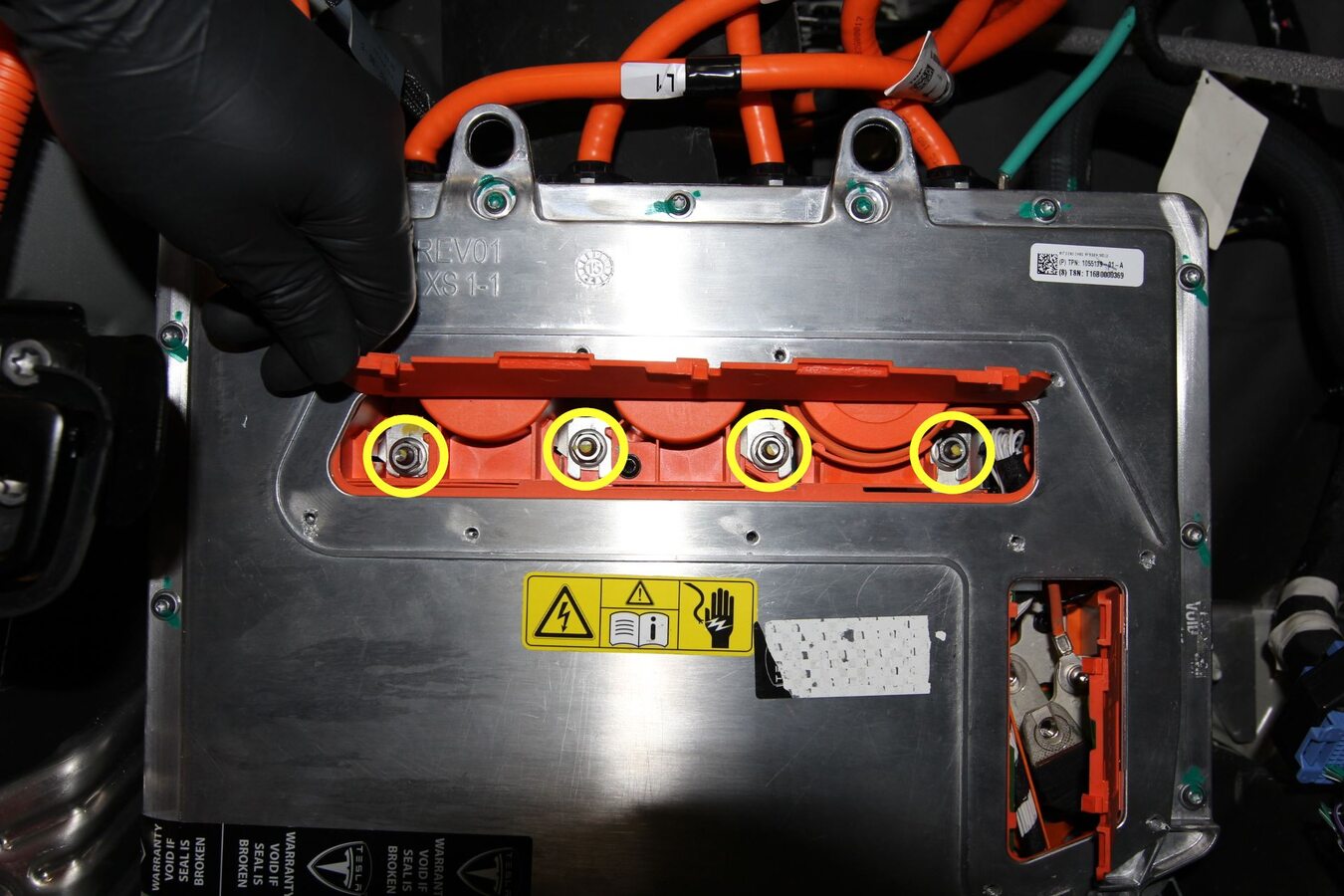 - Lift the charger up, and then remove and discard the bolts (x2) that attach the HV cables to the rapid splitter at the bottom of the charger.