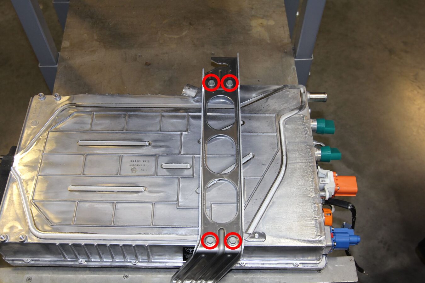 - Install new bolts (x4) that attach the mounting bracket onto the new charger (torque 7 Nm).