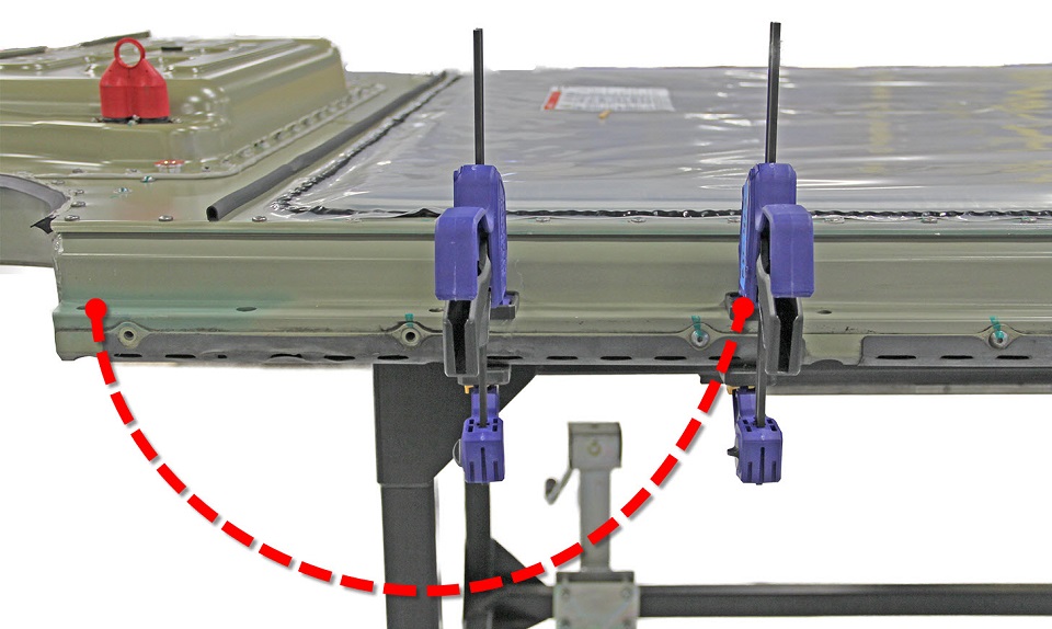 Release the clamp closest to the front of the HV battery and move it adjacent to the next remaining front bolt.