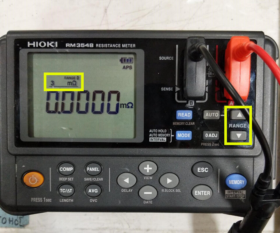 - Use the up arrow and down arrow buttons to set the resistance meter to the 3mΩ range.