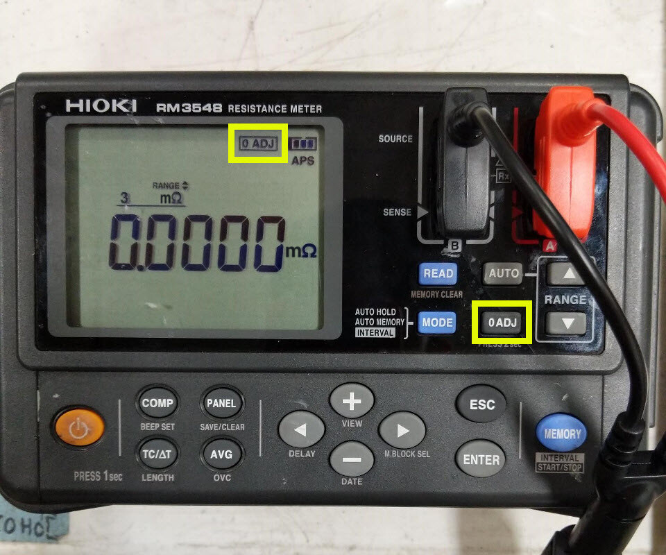- Power on the Hioki resistance meter, and allow a few minutes for it to thermally stabilize.