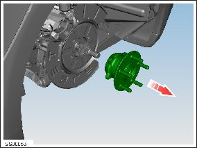 - Remove the screw that secures the brake rotor to the hub, then remove the brake rotor (torque 17 Nm).