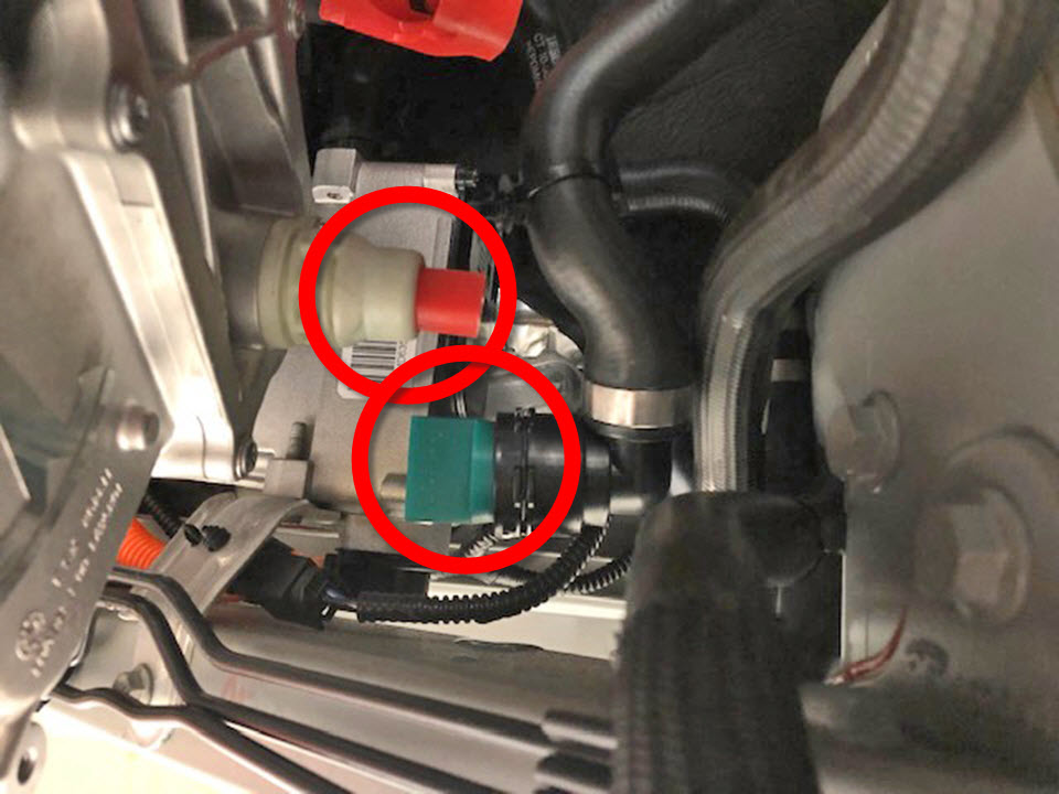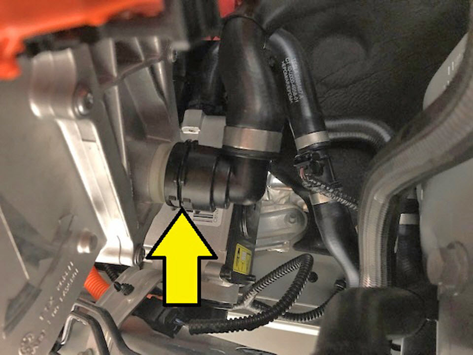 - Remove the spring clip, and then disconnect the lower coolant hose from the front drive unit heat exchanger. Plug both the heat exchanger and the hose using plugs from the coolant hose plug kit.